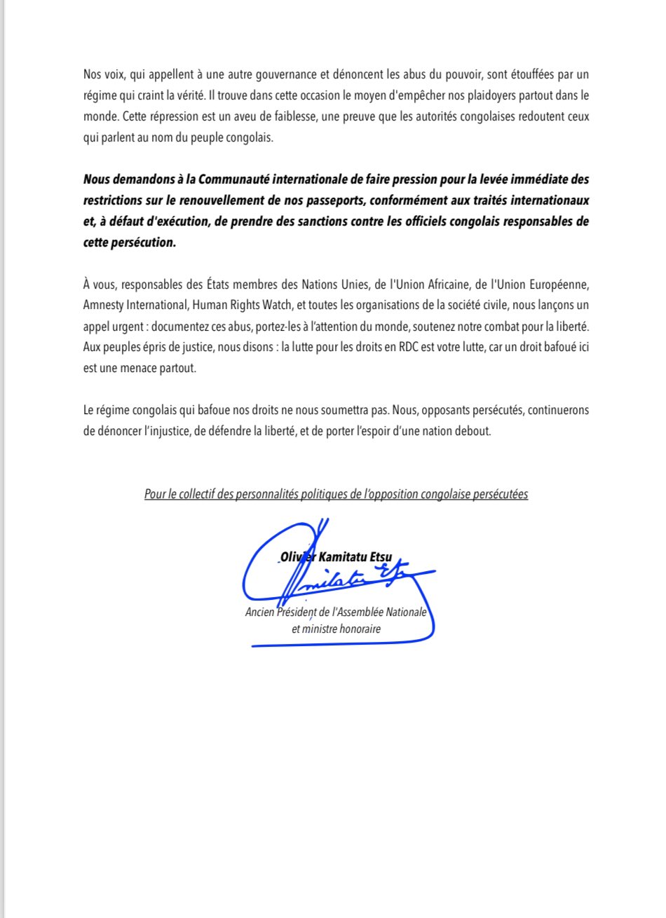 Radio Okapi rapportait qu’une autre déclaration rendue publique vendredi 2 mai 2025, à Lubumbashi, dans laquelle Khiller Mubambe, président du groupe parlementaire "Ensemble pour la République", a dénoncé le fait que certains opposants soient empêchés de jouir de leur droit d’obtenir un passeport sans faire mention des origines comme l’une des raisons (lien archivé ici).