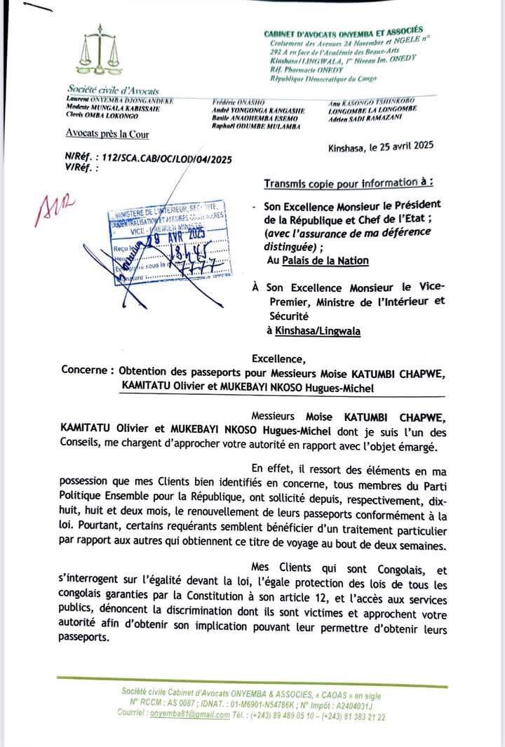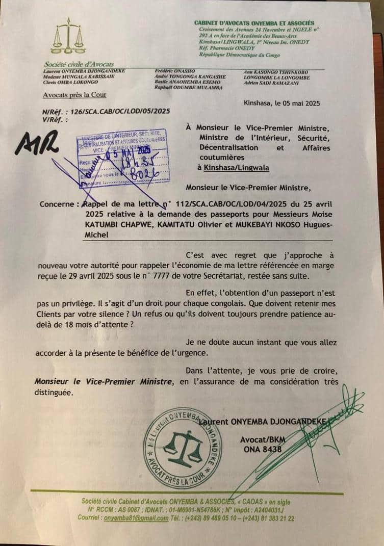 Le 5 mai dernier, le journaliste congolais Steve Wembi, a publié sur son compte X, une lettre p* 112/SCA.CAB/OC/LOD/04/2025 du 25 avril 2025 relative à la demande des passeports publiée (lien archivé ici). L’avocat de Katumbi évoque dans cette nouvelle correspondance adressée au Ministre de l’intérieur la question de droit fondamental dans l’obtention du passeport.