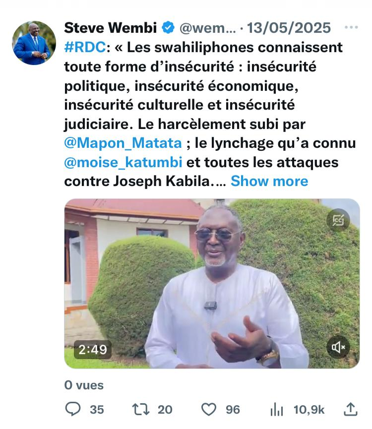 « #RDC: Les swahiliphones connaissent toute forme d’insécurité : insécurité politique, insécurité économique, insécurité culturelle et insécurité judiciaire [...] Aujourd’hui notre frère Katumbi est envoyé en exil. Il doit être libre de vaquer à ses occupations ici au pays. On lui refuse même le passeport, tout simplement parce qu’il est Swahiliphone [...] La Swahiliphonie arrive pour délivrer ces compatriotes qui ne se sentent plus libres dans leur propre pays », Moussa Kitoko, président de USWAHILI.