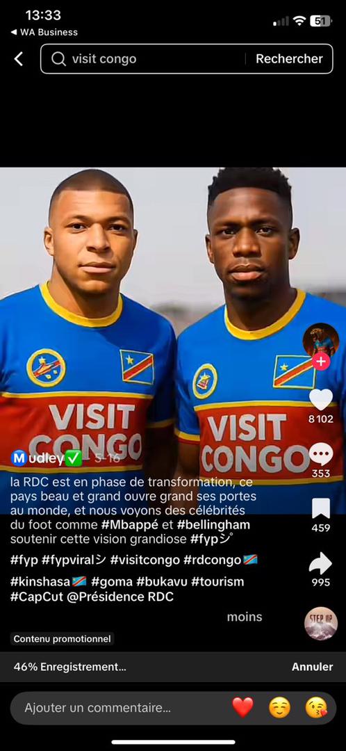 « La RDC est en phase de transformation, ce pays beau et grand ouvre grand ses portes au monde et nous voyons des célébrités du foot comme #Mbappé et #bellingham soutenir cette grandiose… », écrit ce compte TikTok.
