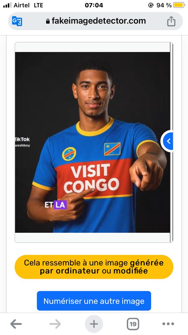 Il n’y a pas assez de ressemblance dans leurs maillots. Sur le côté droit du maillot de Bellingham, par exemple, on aperçoit le drapeau de la RDC tout petit, encerclé en jaune et deux étoiles sur les côtés. Ce qui diffère de ce qu’on peut voir sur le côté droit des maillots des autres joueurs figurant sur la vidéo.