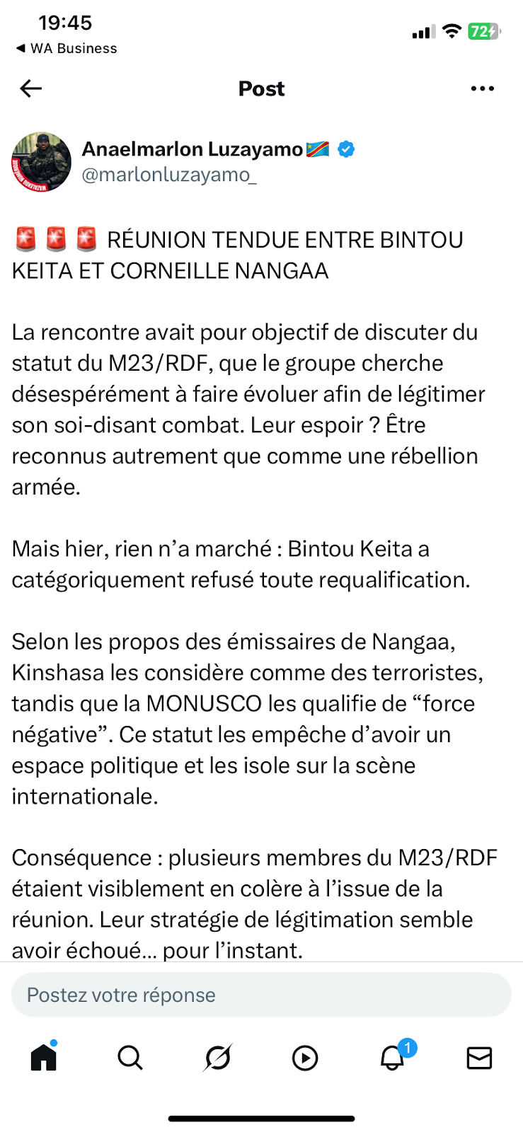 Sur X, Lawrence Kanyuka, porte-parole et point focal pour la communication de l’AFC/M23, a déclaré que la rencontre tenue à Goma entre leur mouvement et la délégation de la Monusco, conduite par Bintou Keita, s’était déroulée dans un climat constructif, riche en échanges et porteur d’espoir en faveur de la paix (lien archivé ici).