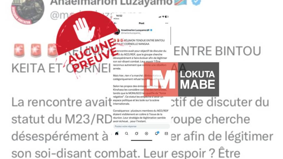 Aucun média n’a rapporté l’information selon laquelle il y aurait une tension entre Bintou Keita et Corneille Nangaa lors de la réunion tenue à Goma dans la province du Nord-Kivu le 13 juin 2025. Ni l’AFC/M23 n’a rapporté ces prétendus faits.