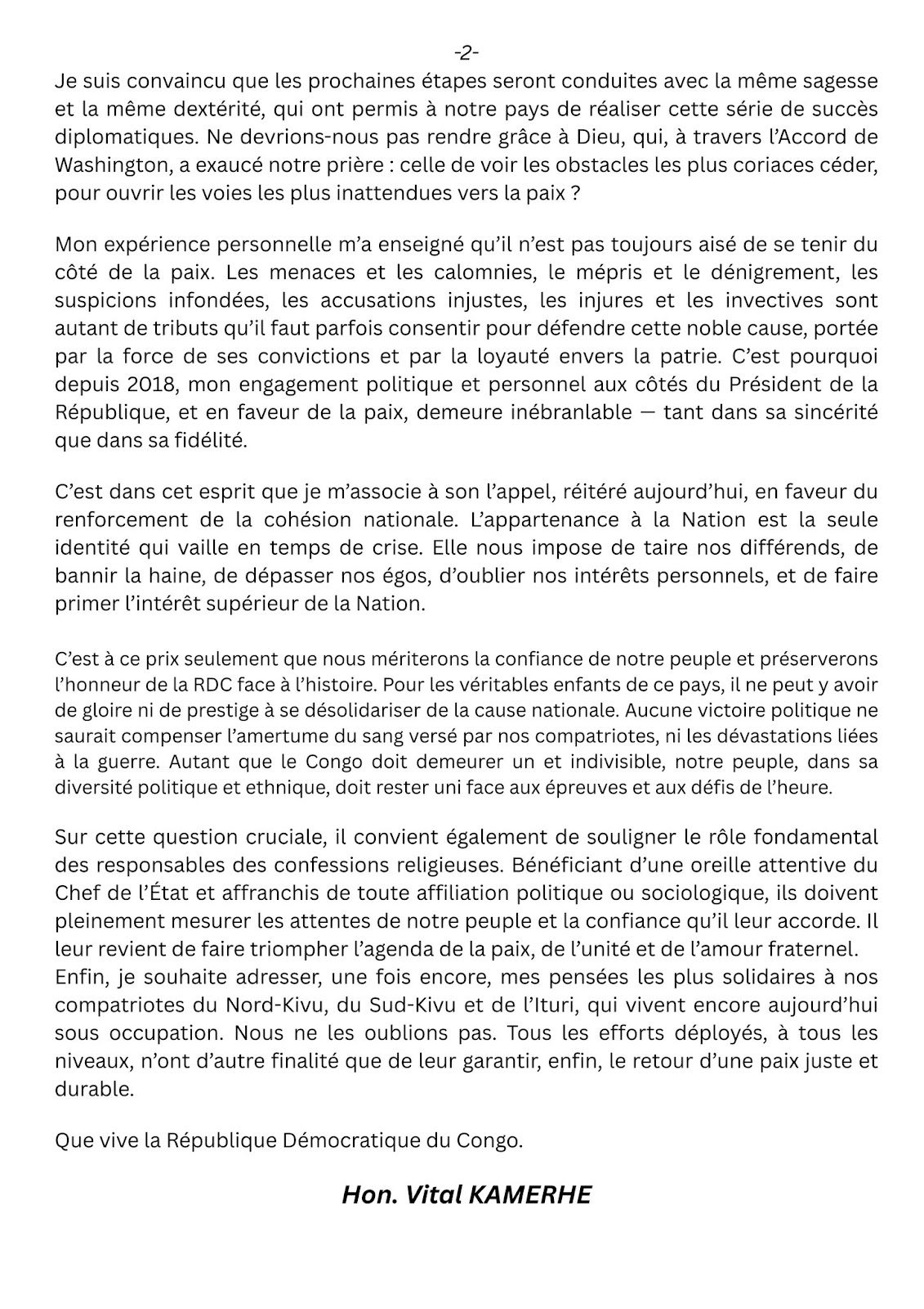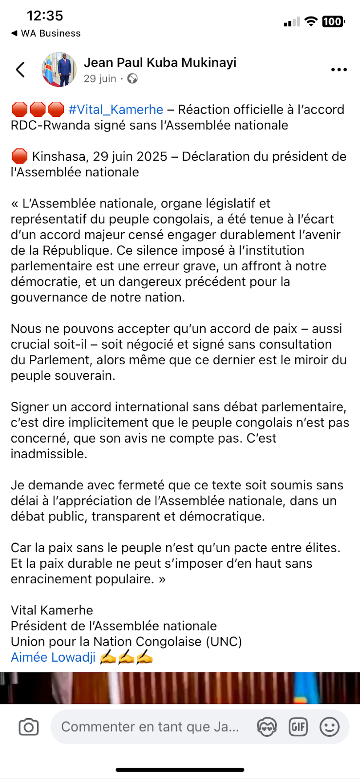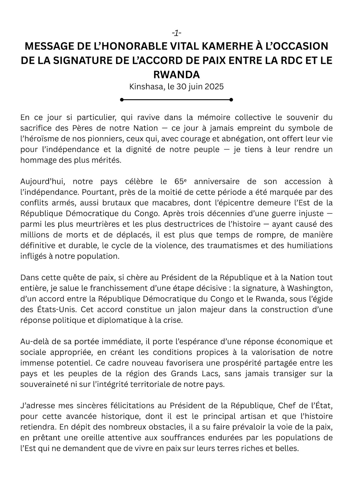 Le 30 juin 2025, le président de l’Assemblée nationale, Vital Kamerhe Lwa Kanyiginyi Nkingi a publié sur son compte X, un message à l'occasion de la signature de l'accord de paix entre la République Démocratique du Congo et le Rwanda (lien archivé ici). Dans ce communiqué, il exprime sa satisfaction à la suite de la signature de l’accord de paix entre la RDC et le Rwanda.