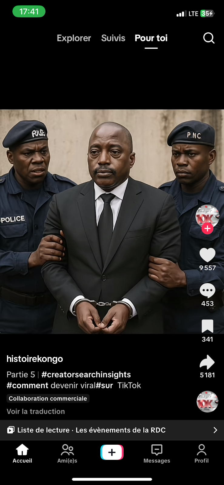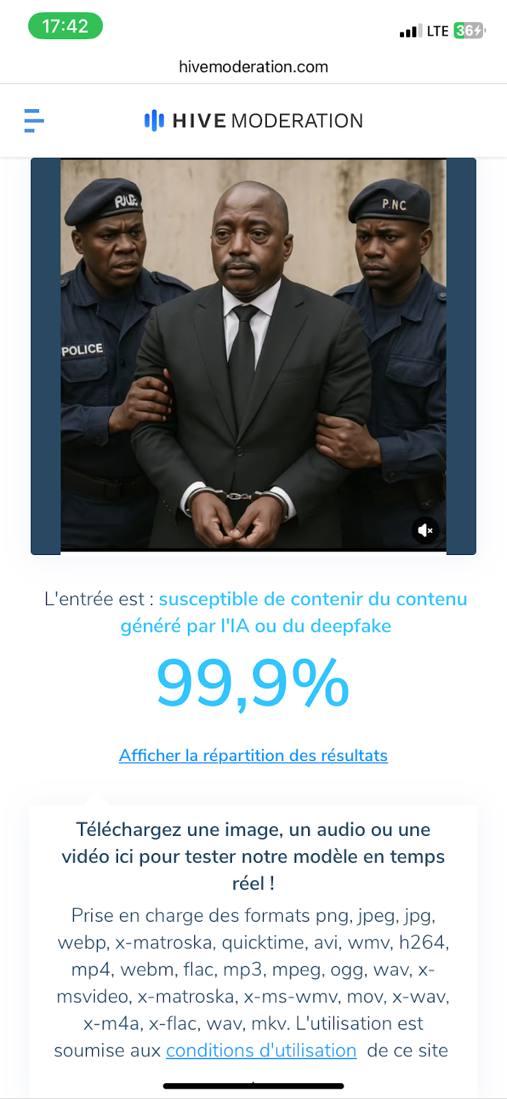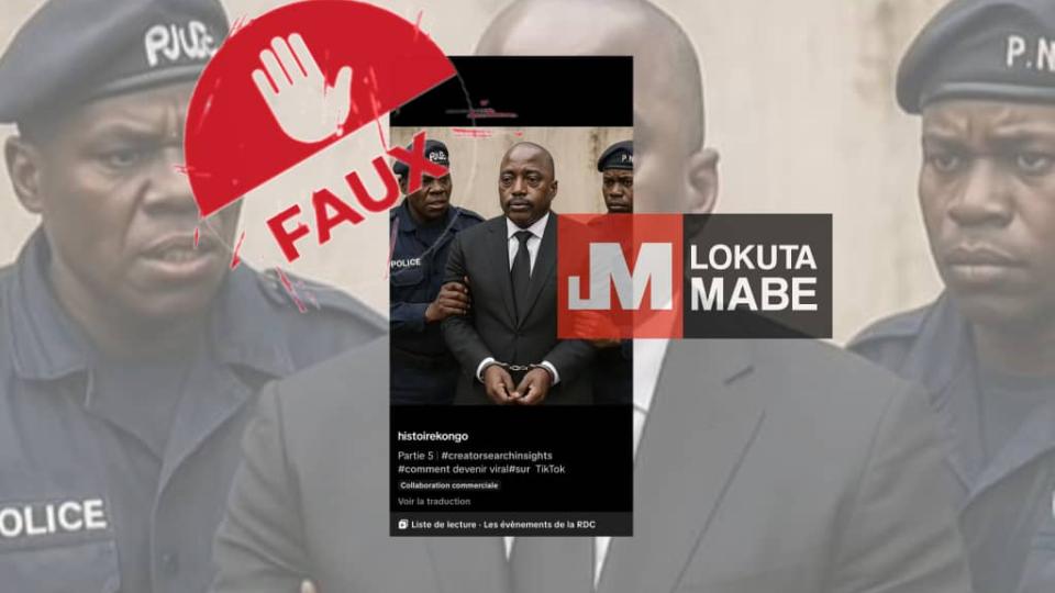 Un compte TikTok a publié, le 11 juillet 2025, une séquence vidéo de 14 secondes montrant l’ancien président de la République démocratique du Congo, Joseph Kabila Kabange, arrêté par deux policiers. La voix off dans la vidéo affirme qu’il serait arrêté pour des crimes commis à Goma. Attention : il s’agit d’une vidéo générée par l’intelligence artificielle.