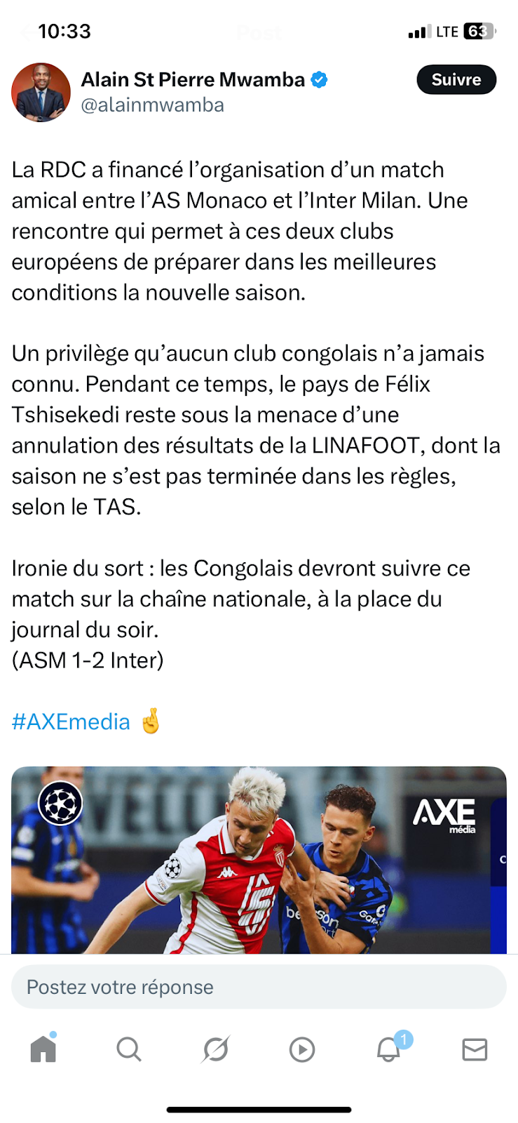 Sur le réseau social X, un internaute affirme dans une publication datant du 8 août 2025 que la République démocratique du Congo aurait financé l’organisation du match amical entre le club français de l’AS Monaco et le club italien de l’Internazionale Milano pour aider les deux équipes à mieux préparer la nouvelle saison. Attention : La RDC n’est pas impliquée financièrement dans l’organisation de cette rencontre.
