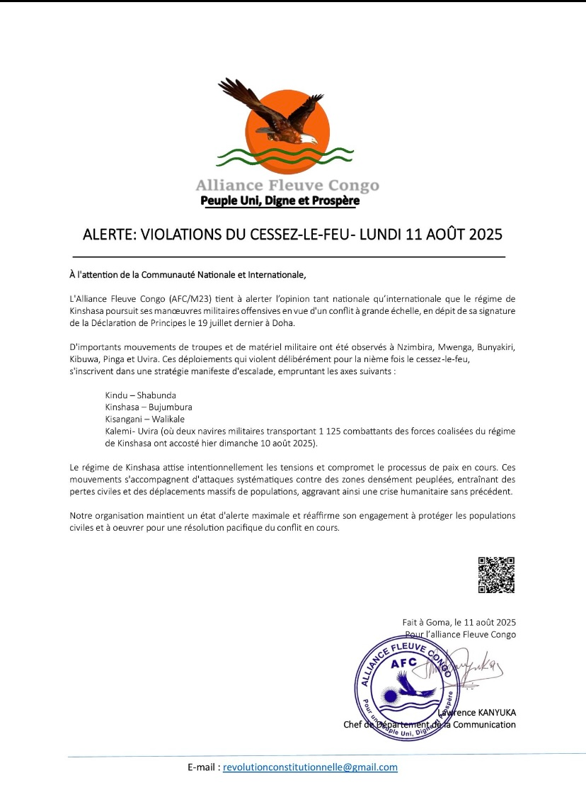 De son côté, l'AFC/M23 a alerté sur les manœuvres offensives du gouvernement congolais, malgré la signature de la déclaration des principes à Doha. D'importants mouvements de troupes et de matériel militaire ont été observés à Nzimbira, Mwenga, Bunyakiri, Kibuwa, Pinga et Uvira, violant le cessez-le-feu et témoignant d'une stratégie d'escalade, d’après ce mouvement politico-militaire.