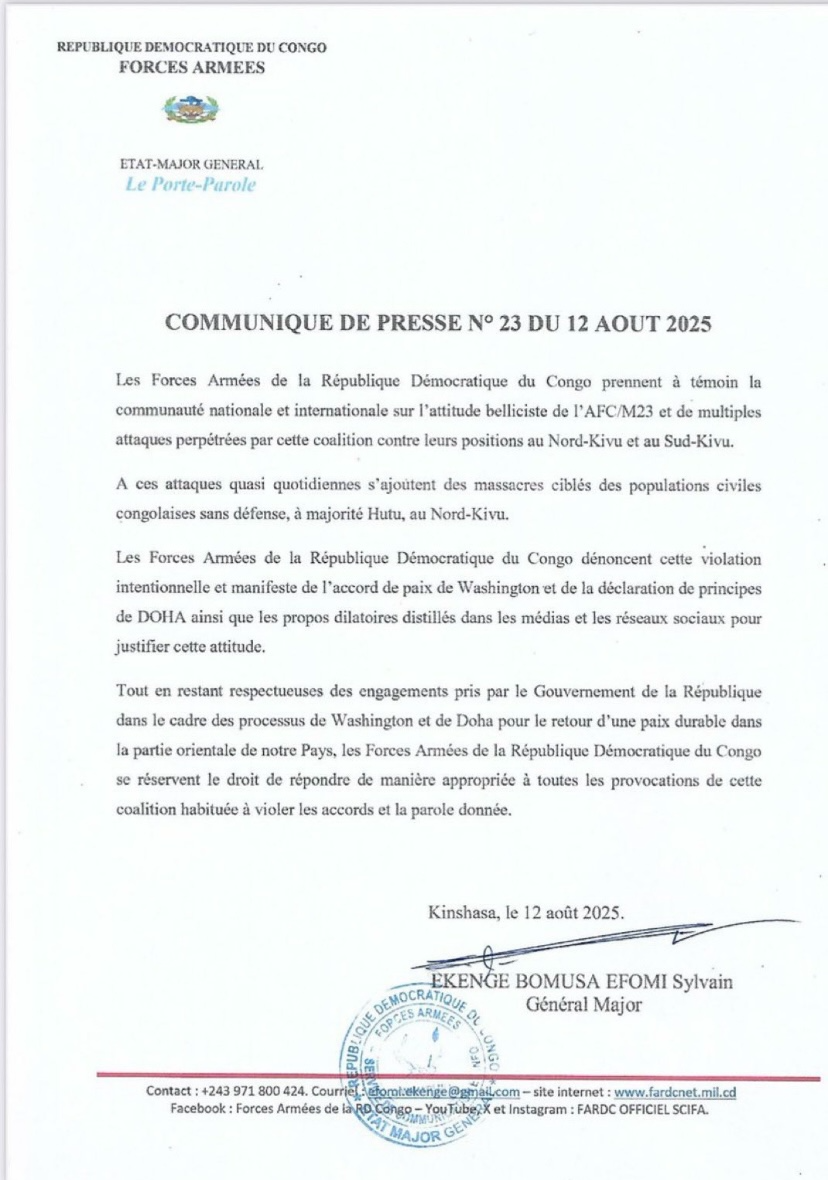 Les FARDC critiquent la violation des accords de paix de Washington et de la déclaration de Doha, ainsi que les justifications « mensongères » diffusées dans les médias.