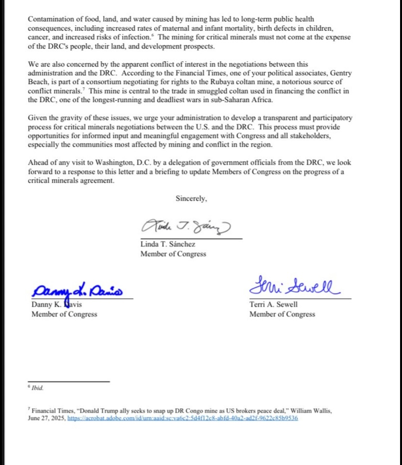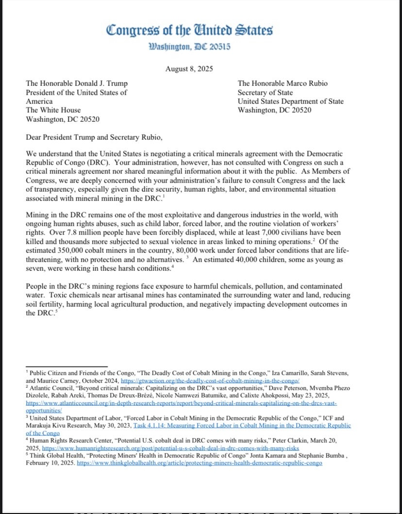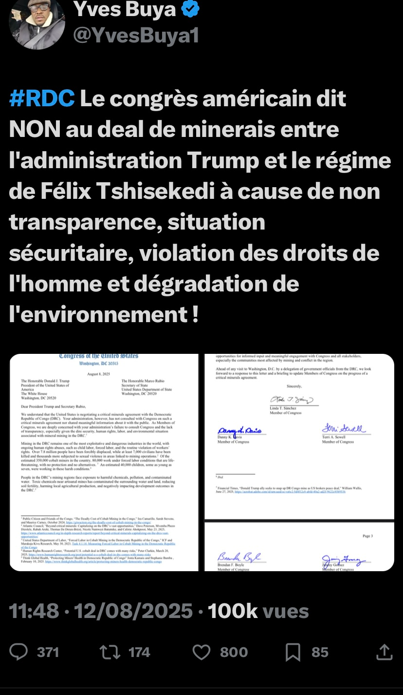 Nous avons pris connaissance du document émanant du Congrès des États-Unis, datant du 8 août 2025, une lettre adressée au Président Donald J. Trump et au Secrétaire d'État américain, Marco Rubio. Cette lettre soulève d'importantes inquiétudes concernant les négociations d'un accord sur les minéraux critiques avec la RDC.