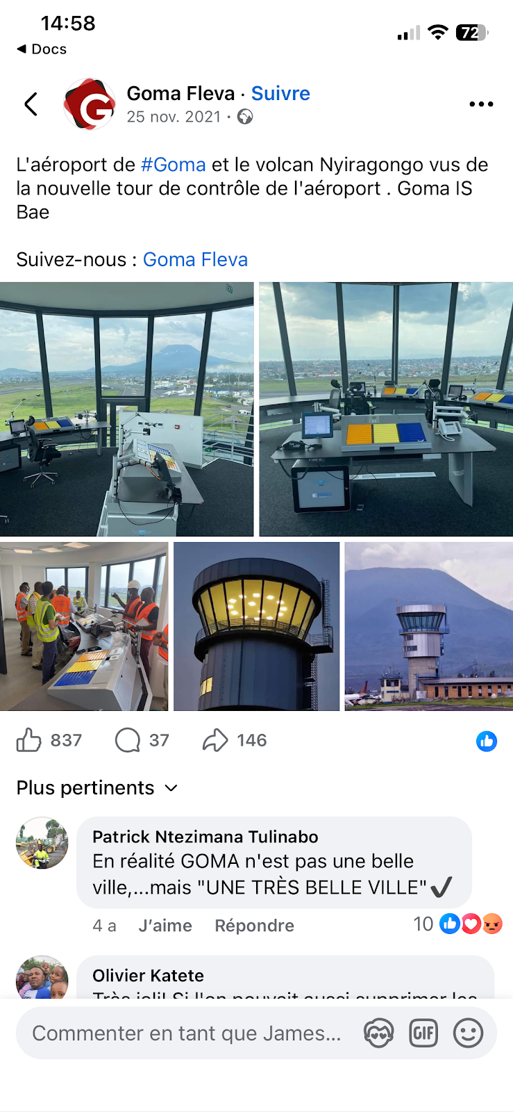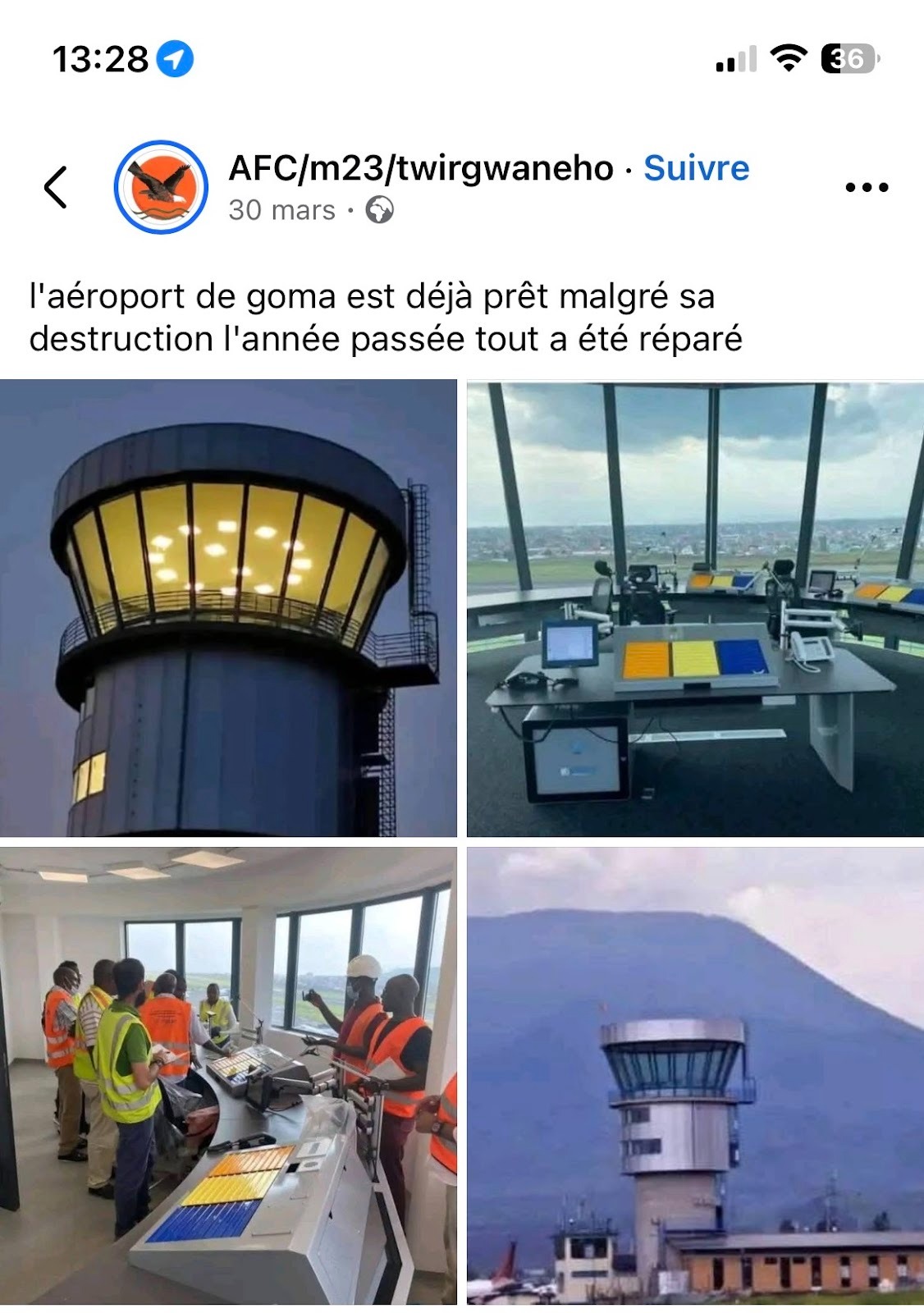 Cette publication est accompagnée de quatre photos sur lesquelles nous pouvons apercevoir la Tour de contrôle de l'aéroport international de Goma, aussi bien à l'extérieur qu'à l'intérieur (lien archivé ici). La légende soutient que l’aéroport de Goma, bien que détruit l’année dernière, serait désormais opérationnel après avoir été réhabilité.